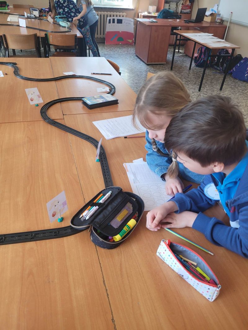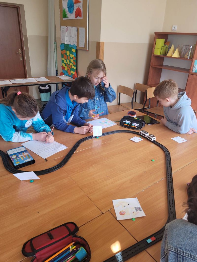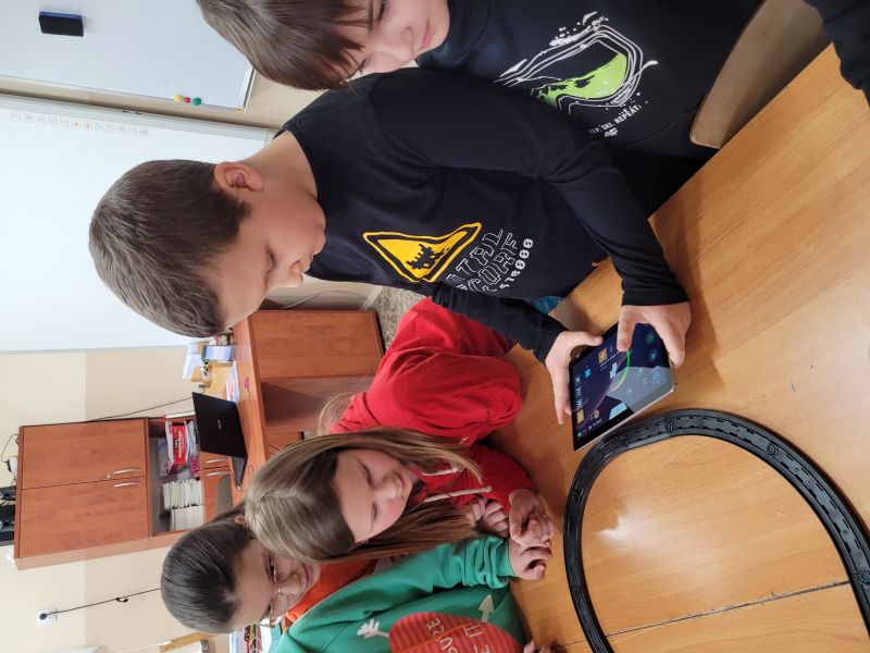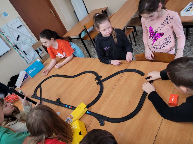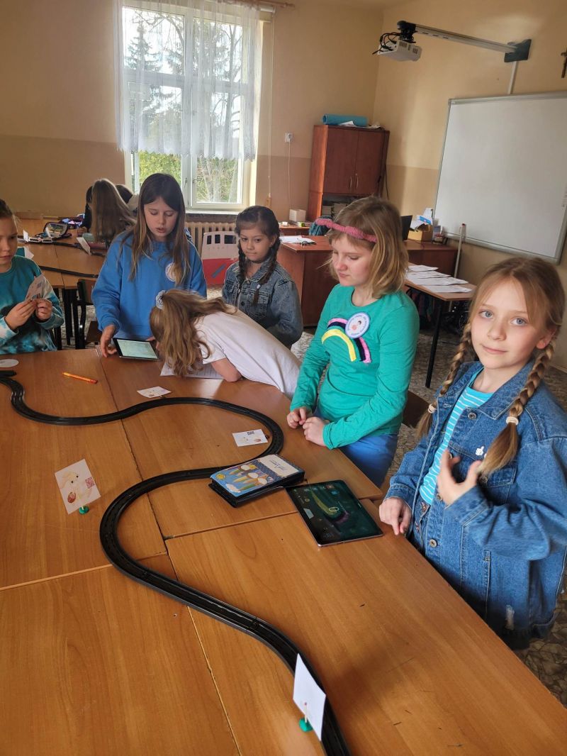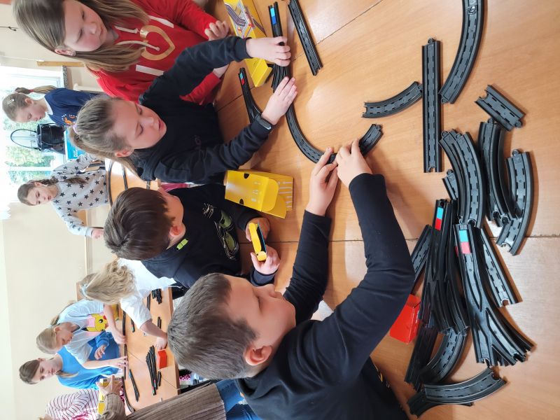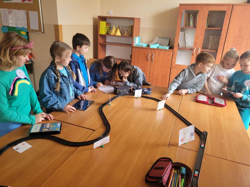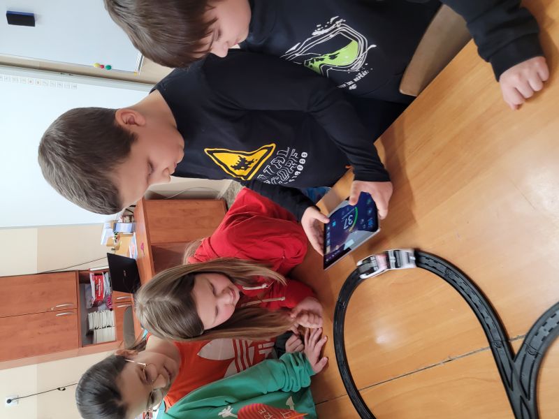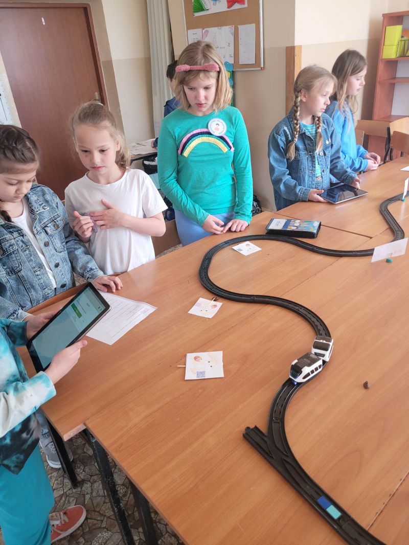 nasi uczniowie z wykorzystaniem tabletów uczyli się kodowania z inteligentnym pociągiem INTELINO. Pociąg wykorzystuje